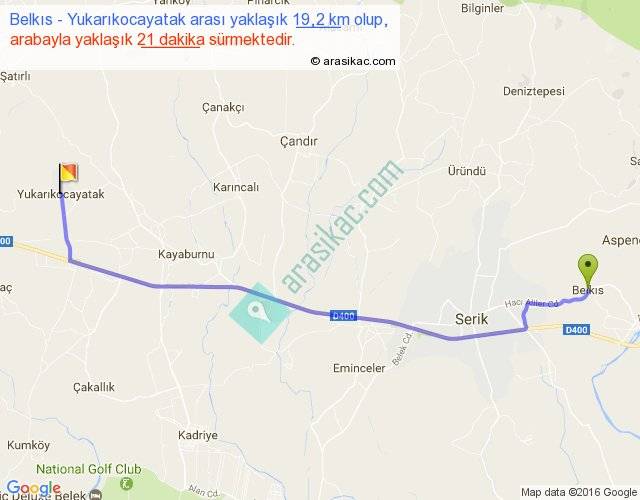 Belkıs - Yukarıkocayatak arası yaklaşık olarak 90 km/h ile yukarıda belirtilen sürede olup, iki yerin kuş uçuşu uzaklığı (mesafesi) 16'dir. Yolculuk otobüsle 27 dakika sürmektedir.