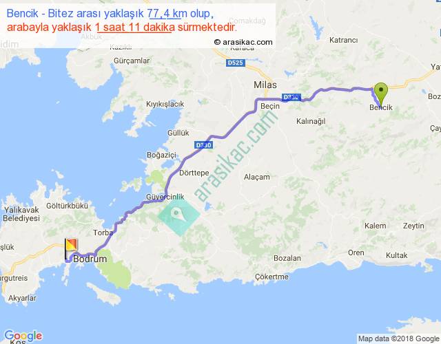 Bencik - Bitez arası yaklaşık olarak 90 km/h ile yukarıda belirtilen sürede olup, iki yerin kuş uçuşu uzaklığı (mesafesi) 61'dir. Yolculuk otobüsle 1 saat 32 dakika sürmektedir.