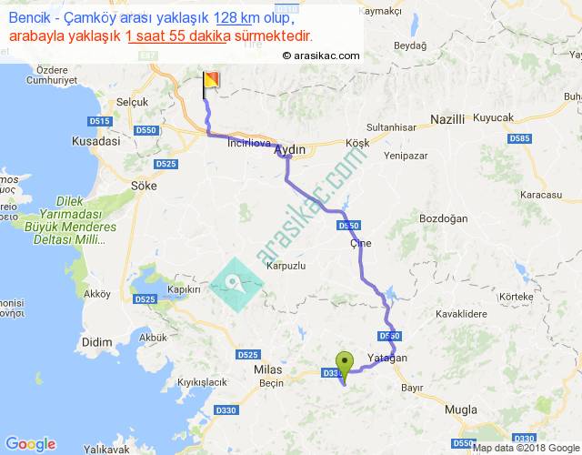Bencik - Çamköy arası yaklaşık olarak 90 km/h ile yukarıda belirtilen sürede olup, iki yerin kuş uçuşu uzaklığı (mesafesi) 84'dir. Yolculuk otobüsle 2 saat 29 dakika sürmektedir.
