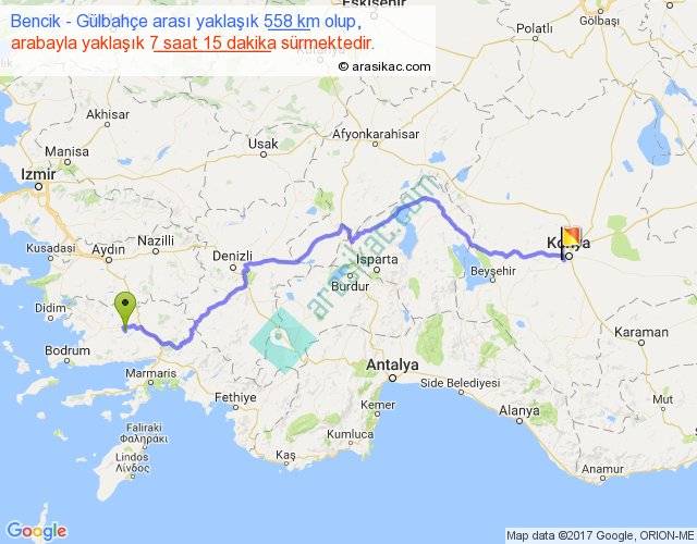 Bencik - Gülbahçe arası yaklaşık olarak 90 km/h ile yukarıda belirtilen sürede olup, iki yerin kuş uçuşu uzaklığı (mesafesi) 393'dir. Eğer belirtilen yerler arasında uçak seferi var ise bu süre uçakla 36 dakika'ya kadar düşebilir. Yolculuk otobüsle 9 saat 25 dakika sürmektedir.