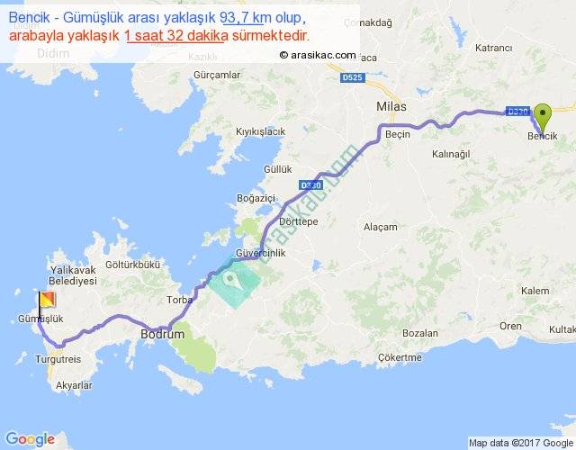 Bencik - Gümüşlük arası yaklaşık olarak 90 km/h ile yukarıda belirtilen sürede olup, iki yerin kuş uçuşu uzaklığı (mesafesi) 72'dir. Yolculuk otobüsle 1 saat 59 dakika sürmektedir.