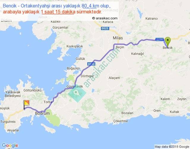 Bencik - Ortakentyahşi arası yaklaşık olarak 90 km/h ile yukarıda belirtilen sürede olup, iki yerin kuş uçuşu uzaklığı (mesafesi) 64'dir. Yolculuk otobüsle 1 saat 37 dakika sürmektedir.