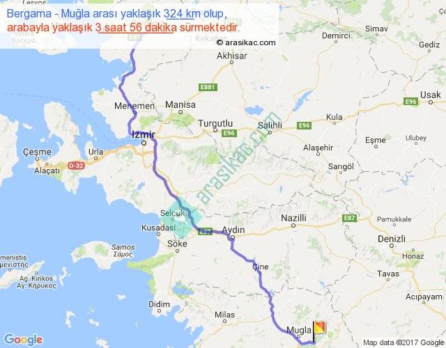Bergama - Muğla arası yaklaşık olarak 90 km/h ile yukarıda belirtilen sürede olup, iki yerin kuş uçuşu uzaklığı (mesafesi) 243'dir. Yolculuk otobüsle 5 saat 6 dakika sürmektedir.