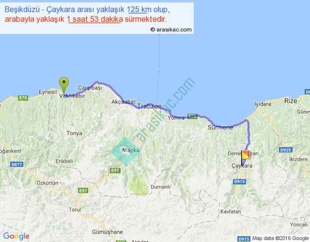 Beşikdüzü - Çaykara arası yaklaşık olarak 90 km/h ile yukarıda belirtilen sürede olup, iki yerin kuş uçuşu uzaklığı (mesafesi) 91'dir. Yolculuk otobüsle 2 saat 26 dakika sürmektedir.