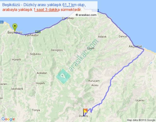 Beşikdüzü - Düzköy arası yaklaşık olarak 90 km/h ile yukarıda belirtilen sürede olup, iki yerin kuş uçuşu uzaklığı (mesafesi) 25'dir. Yolculuk otobüsle 1 saat 21 dakika sürmektedir.