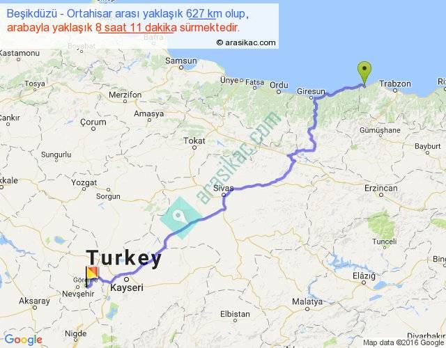 Beşikdüzü - Ortahisar arası yaklaşık olarak 90 km/h ile yukarıda belirtilen sürede olup, iki yerin kuş uçuşu uzaklığı (mesafesi) 458'dir. Eğer belirtilen yerler arasında uçak seferi var ise bu süre uçakla 42 dakika'ya kadar düşebilir. Yolculuk otobüsle 10 saat 38 dakika sürmektedir.