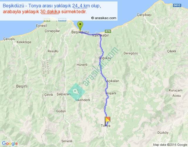 Beşikdüzü - Tonya arası yaklaşık olarak 90 km/h ile yukarıda belirtilen sürede olup, iki yerin kuş uçuşu uzaklığı (mesafesi) 19'dir. Yolculuk otobüsle 39 dakika sürmektedir.