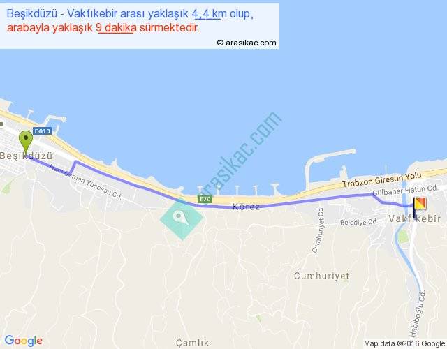 Beşikdüzü - Vakfıkebir arası yaklaşık olarak 90 km/h ile yukarıda belirtilen sürede olup, iki yerin kuş uçuşu uzaklığı (mesafesi) 4'dir. Yolculuk otobüsle 11 dakika sürmektedir.