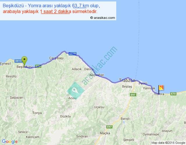 Beşikdüzü - Yomra arası yaklaşık olarak 90 km/h ile yukarıda belirtilen sürede olup, iki yerin kuş uçuşu uzaklığı (mesafesi) 54'dir. Yolculuk otobüsle 1 saat 20 dakika sürmektedir.