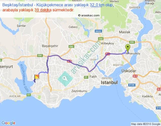 Beşiktaş İstanbul - Küçükçekmece arası yaklaşık olarak 90 km/h ile yukarıda belirtilen sürede olup, iki yerin kuş uçuşu uzaklığı (mesafesi) 22'dir. Yolculuk otobüsle 50 dakika sürmektedir.