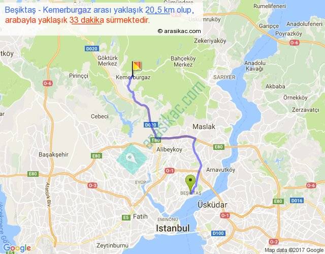 Beşiktaş - Kemerburgaz arası yaklaşık olarak 90 km/h ile yukarıda belirtilen sürede olup, iki yerin kuş uçuşu uzaklığı (mesafesi) 15'dir. Yolculuk otobüsle 42 dakika sürmektedir.