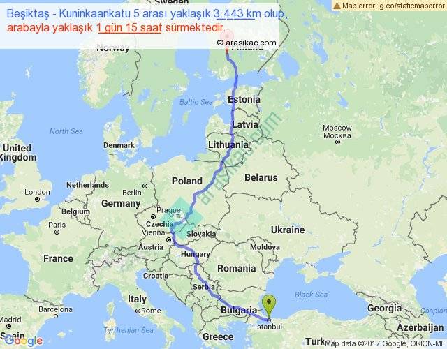 Beşiktaş - Kuninkaankatu 5 arası yaklaşık olarak 90 km/h ile yukarıda belirtilen sürede olup, iki yerin kuş uçuşu uzaklığı (mesafesi) 2286'dir. Eğer belirtilen yerler arasında uçak seferi var ise bu süre uçakla 3 saat 31 dakika'ya kadar düşebilir. Yolculuk otobüsle 2 gün 2 saat sürmektedir.