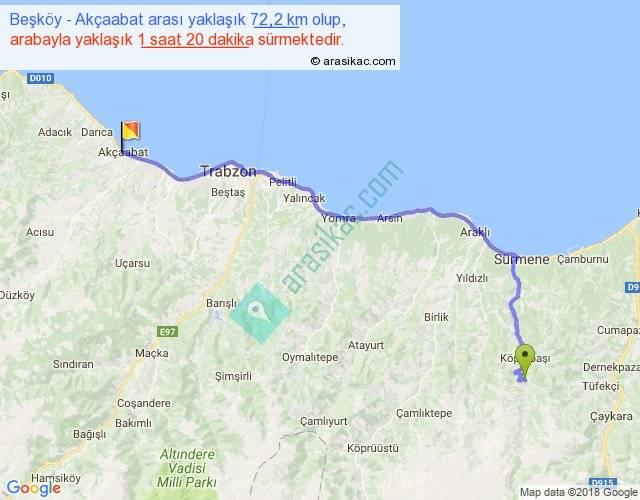 Beşköy - Akçaabat arası yaklaşık olarak 90 km/h ile yukarıda belirtilen sürede olup, iki yerin kuş uçuşu uzaklığı (mesafesi) 53'dir. Yolculuk otobüsle 1 saat 44 dakika sürmektedir.
