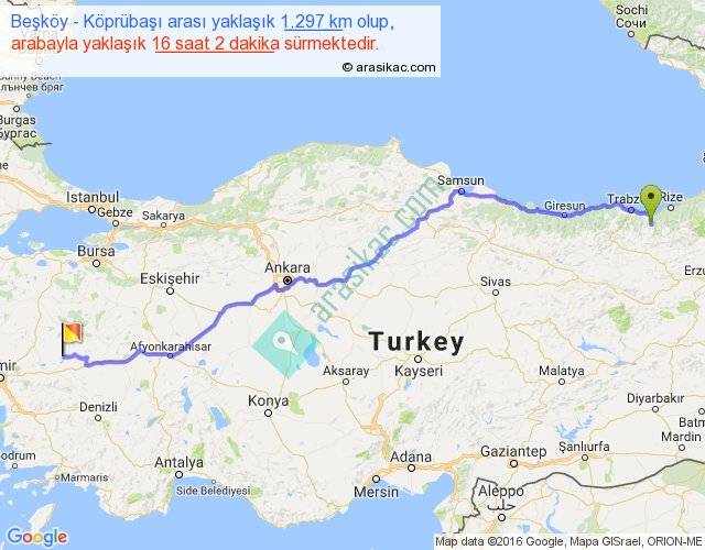 Beşköy - Köprübaşı arası yaklaşık olarak 90 km/h ile yukarıda belirtilen sürede olup, iki yerin kuş uçuşu uzaklığı (mesafesi) 1020'dir. Eğer belirtilen yerler arasında uçak seferi var ise bu süre uçakla 1 saat 34 dakika'ya kadar düşebilir. Yolculuk otobüsle 20 saat 50 dakika sürmektedir.