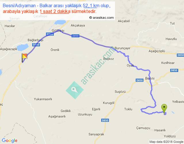 Besni Adıyaman - Balkar arası yaklaşık olarak 90 km/h ile yukarıda belirtilen sürede olup, iki yerin kuş uçuşu uzaklığı (mesafesi) 32'dir. Yolculuk otobüsle 1 saat 20 dakika sürmektedir.