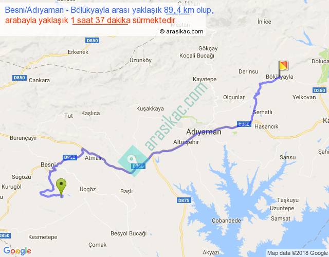 Besni Adıyaman - Bölükyayla arası yaklaşık olarak 90 km/h ile yukarıda belirtilen sürede olup, iki yerin kuş uçuşu uzaklığı (mesafesi) 58'dir. Yolculuk otobüsle 2 saat 6 dakika sürmektedir.