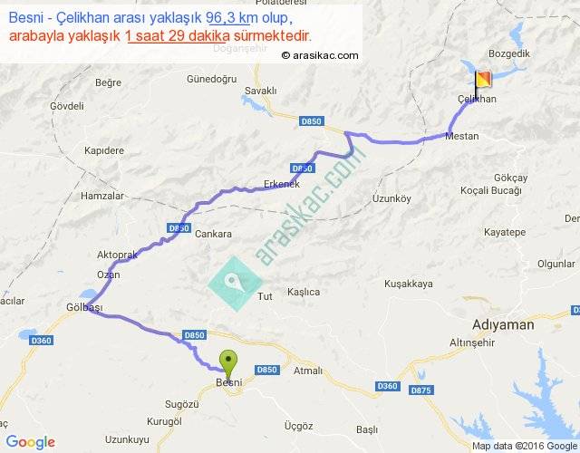 Besni - Çelikhan arası yaklaşık olarak 90 km/h ile yukarıda belirtilen sürede olup, iki yerin kuş uçuşu uzaklığı (mesafesi) 50'dir. Yolculuk otobüsle 1 saat 55 dakika sürmektedir.