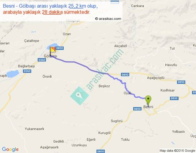 Besni - Gölbaşı arası yaklaşık olarak 90 km/h ile yukarıda belirtilen sürede olup, iki yerin kuş uçuşu uzaklığı (mesafesi) 22'dir. Yolculuk otobüsle 36 dakika sürmektedir.