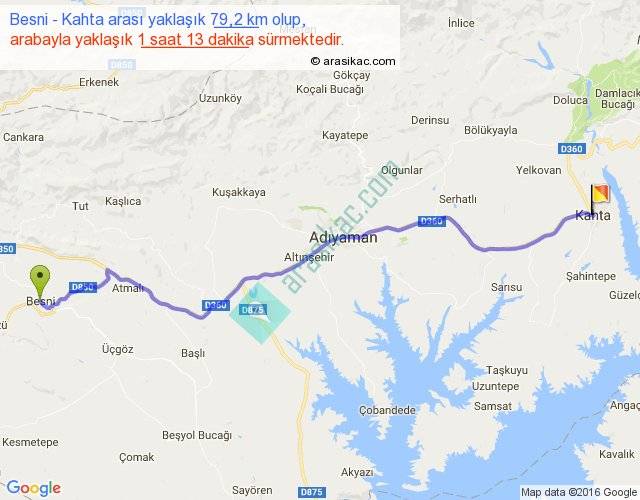 Besni - Kahta arası yaklaşık olarak 90 km/h ile yukarıda belirtilen sürede olup, iki yerin kuş uçuşu uzaklığı (mesafesi) 67'dir. Yolculuk otobüsle 1 saat 34 dakika sürmektedir.