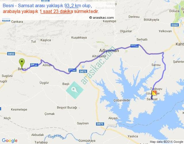 Besni - Samsat arası yaklaşık olarak 90 km/h ile yukarıda belirtilen sürede olup, iki yerin kuş uçuşu uzaklığı (mesafesi) 56'dir. Yolculuk otobüsle 1 saat 47 dakika sürmektedir.