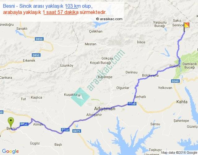Besni - Sincik arası yaklaşık olarak 90 km/h ile yukarıda belirtilen sürede olup, iki yerin kuş uçuşu uzaklığı (mesafesi) 77'dir. Yolculuk otobüsle 2 saat 32 dakika sürmektedir.