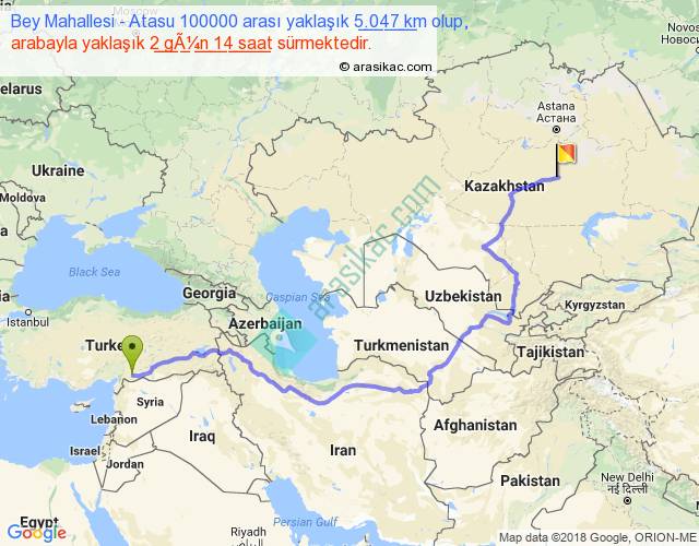 Bey Mahallesi - Atasu 100000 arası yaklaşık olarak 90 km/h ile yukarıda belirtilen sürede olup, iki yerin kuş uçuşu uzaklığı (mesafesi) 3025'dir. Eğer belirtilen yerler arasında uçak seferi var ise bu süre uçakla 4 saat 39 dakika'ya kadar düşebilir. Yolculuk otobüsle 3 gün 8 saat sürmektedir.