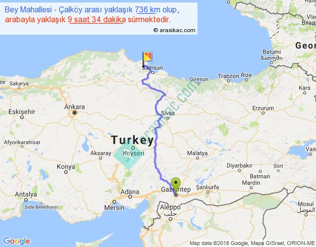 Bey Mahallesi - Çalköy arası yaklaşık olarak 90 km/h ile yukarıda belirtilen sürede olup, iki yerin kuş uçuşu uzaklığı (mesafesi) 500'dir. Eğer belirtilen yerler arasında uçak seferi var ise bu süre uçakla 46 dakika'ya kadar düşebilir. Yolculuk otobüsle 12 saat 26 dakika sürmektedir.