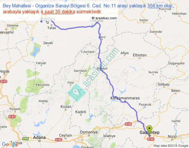Bey Mahallesi - Organize Sanayi Bölgesi 6. Cad. No:11 arası yaklaşık olarak 90 km/h ile yukarıda belirtilen sürede olup, iki yerin kuş uçuşu uzaklığı (mesafesi) 254'dir. Eğer belirtilen yerler arasında uçak seferi var ise bu süre uçakla 23 dakika'ya kadar düşebilir. Yolculuk otobüsle 5 saat 57 dakika sürmektedir.