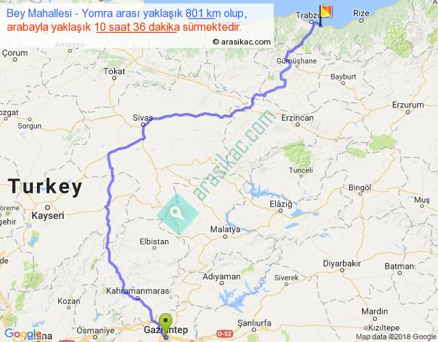 Bey Mahallesi - Yomra arası yaklaşık olarak 90 km/h ile yukarıda belirtilen sürede olup, iki yerin kuş uçuşu uzaklığı (mesafesi) 480'dir. Eğer belirtilen yerler arasında uçak seferi var ise bu süre uçakla 44 dakika'ya kadar düşebilir. Yolculuk otobüsle 13 saat 46 dakika sürmektedir.