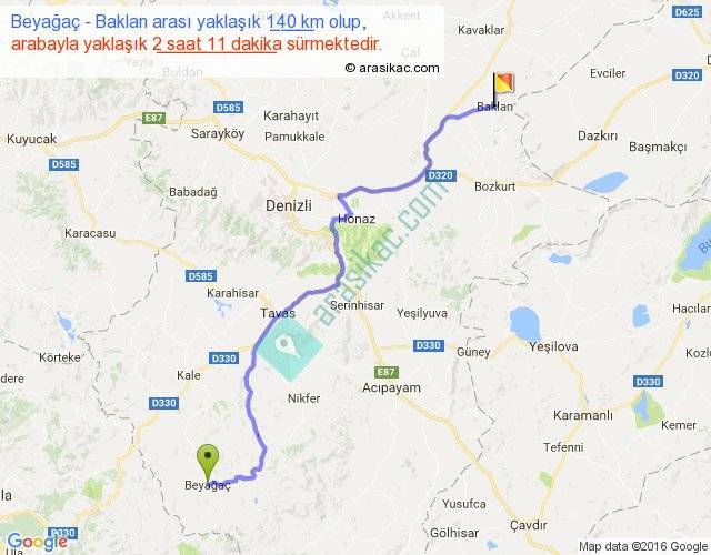 Beyağaç - Baklan arası yaklaşık olarak 90 km/h ile yukarıda belirtilen sürede olup, iki yerin kuş uçuşu uzaklığı (mesafesi) 103'dir. Yolculuk otobüsle 2 saat 50 dakika sürmektedir.