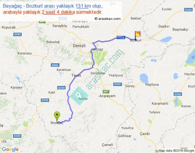 Beyağaç - Bozkurt arası yaklaşık olarak 90 km/h ile yukarıda belirtilen sürede olup, iki yerin kuş uçuşu uzaklığı (mesafesi) 90'dir. Yolculuk otobüsle 2 saat 41 dakika sürmektedir.