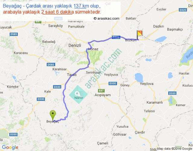 Beyağaç - Çardak arası yaklaşık olarak 90 km/h ile yukarıda belirtilen sürede olup, iki yerin kuş uçuşu uzaklığı (mesafesi) 94'dir. Yolculuk otobüsle 2 saat 43 dakika sürmektedir.