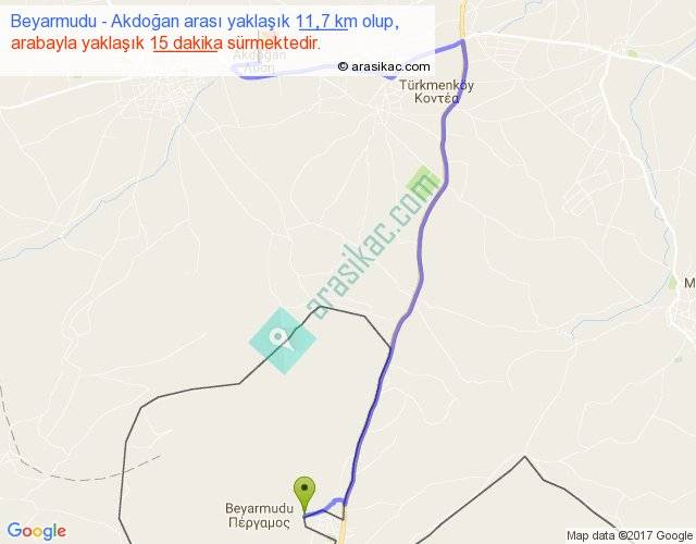 Beyarmudu - Akdoğan arası yaklaşık olarak 90 km/h ile yukarıda belirtilen sürede olup, iki yerin kuş uçuşu uzaklığı (mesafesi) 7'dir. Yolculuk otobüsle 19 dakika sürmektedir.