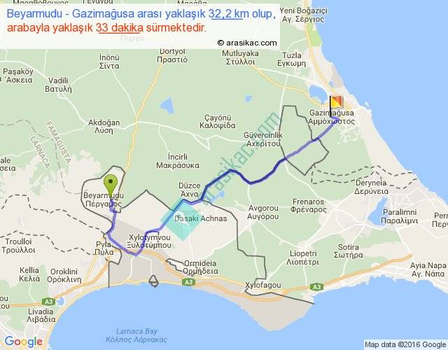Beyarmudu - Gazimağusa arası yaklaşık olarak 90 km/h ile yukarıda belirtilen sürede olup, iki yerin kuş uçuşu uzaklığı (mesafesi) 21'dir. Yolculuk otobüsle 42 dakika sürmektedir.