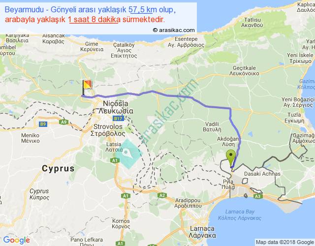 Beyarmudu - Gönyeli arası yaklaşık olarak 90 km/h ile yukarıda belirtilen sürede olup, iki yerin kuş uçuşu uzaklığı (mesafesi) 41'dir. Yolculuk otobüsle 1 saat 28 dakika sürmektedir.