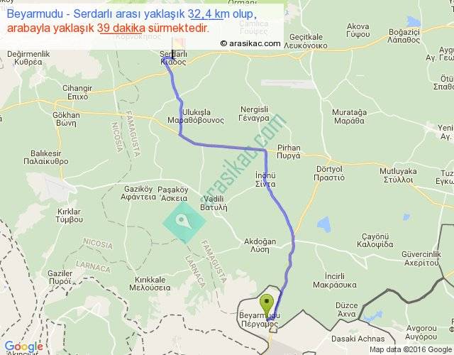 Beyarmudu - Serdarlı arası yaklaşık olarak 90 km/h ile yukarıda belirtilen sürede olup, iki yerin kuş uçuşu uzaklığı (mesafesi) 24'dir. Yolculuk otobüsle 50 dakika sürmektedir.