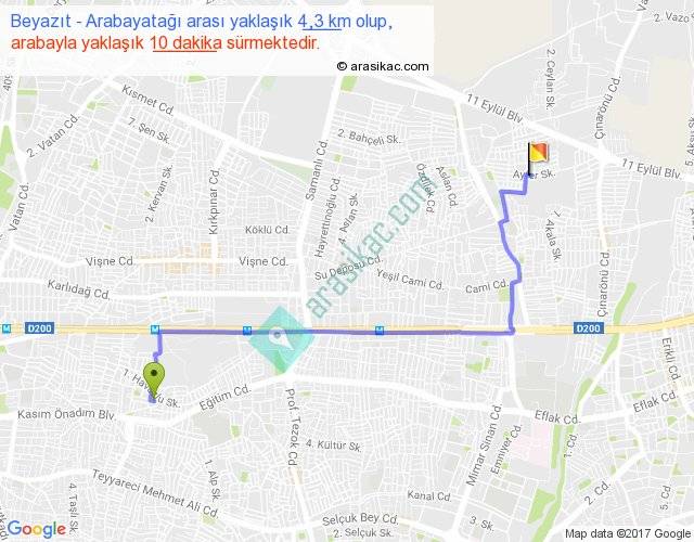 Beyazıt - Arabayatağı arası yaklaşık olarak 90 km/h ile yukarıda belirtilen sürede olup, iki yerin kuş uçuşu uzaklığı (mesafesi) 3'dir. Yolculuk otobüsle 13 dakika sürmektedir.
