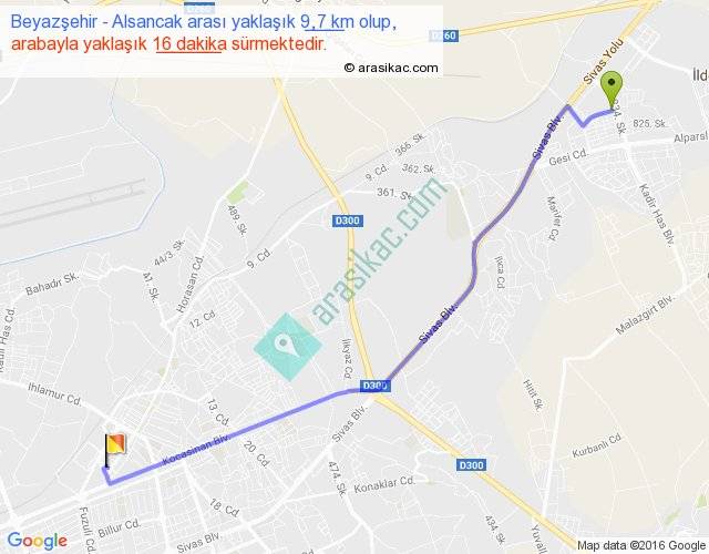 Beyazşehir - Alsancak arası yaklaşık olarak 90 km/h ile yukarıda belirtilen sürede olup, iki yerin kuş uçuşu uzaklığı (mesafesi) 8'dir. Yolculuk otobüsle 20 dakika sürmektedir.