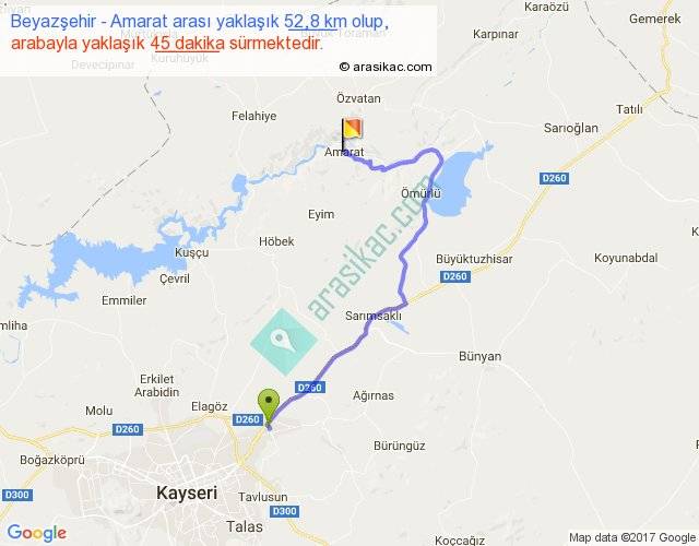 Beyazşehir - Amarat arası yaklaşık olarak 90 km/h ile yukarıda belirtilen sürede olup, iki yerin kuş uçuşu uzaklığı (mesafesi) 31'dir. Yolculuk otobüsle 58 dakika sürmektedir.