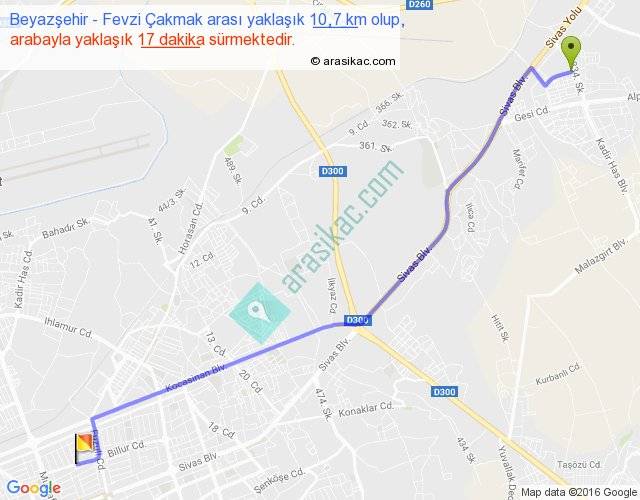 Beyazşehir - Fevzi Çakmak arası yaklaşık olarak 90 km/h ile yukarıda belirtilen sürede olup, iki yerin kuş uçuşu uzaklığı (mesafesi) 9'dir. Yolculuk otobüsle 22 dakika sürmektedir.