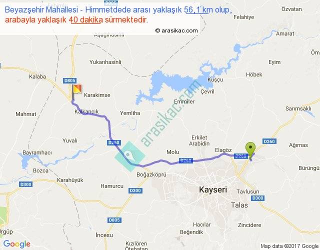Beyazşehir Mahallesi - Himmetdede arası yaklaşık olarak 90 km/h ile yukarıda belirtilen sürede olup, iki yerin kuş uçuşu uzaklığı (mesafesi) 44'dir. Yolculuk otobüsle 52 dakika sürmektedir.