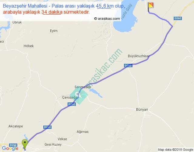 Beyazşehir Mahallesi - Palas arası yaklaşık olarak 90 km/h ile yukarıda belirtilen sürede olup, iki yerin kuş uçuşu uzaklığı (mesafesi) 36'dir. Yolculuk otobüsle 44 dakika sürmektedir.