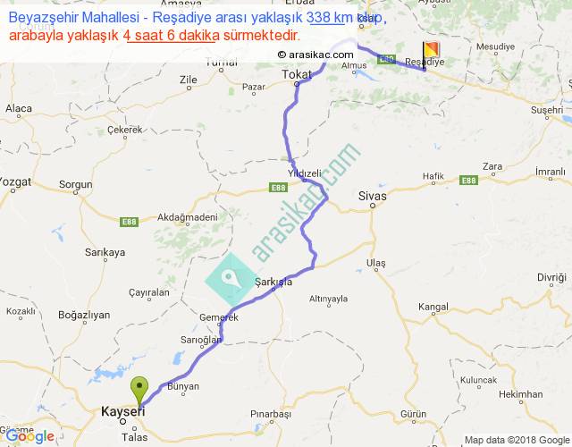 Beyazşehir Mahallesi - Reşadiye arası yaklaşık olarak 90 km/h ile yukarıda belirtilen sürede olup, iki yerin kuş uçuşu uzaklığı (mesafesi) 232'dir. Yolculuk otobüsle 5 saat 19 dakika sürmektedir.