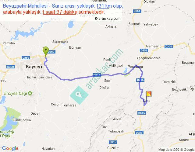 Beyazşehir Mahallesi - Sarız arası yaklaşık olarak 90 km/h ile yukarıda belirtilen sürede olup, iki yerin kuş uçuşu uzaklığı (mesafesi) 86'dir. Yolculuk otobüsle 2 saat 6 dakika sürmektedir.