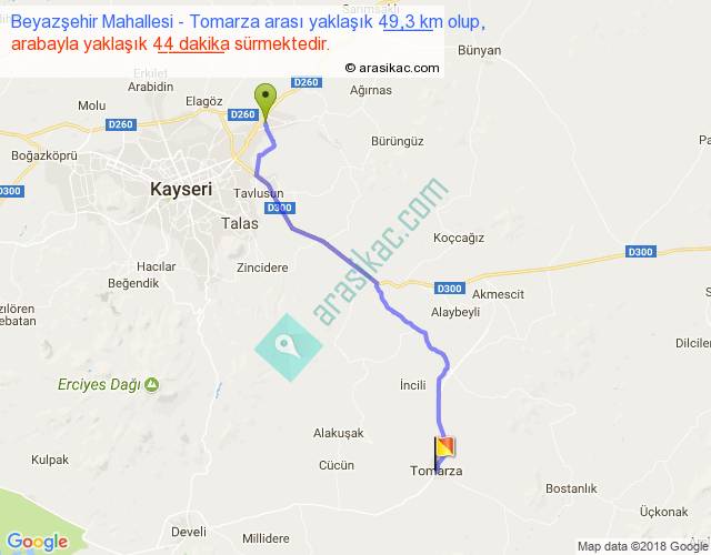 Beyazşehir Mahallesi - Tomarza arası yaklaşık olarak 90 km/h ile yukarıda belirtilen sürede olup, iki yerin kuş uçuşu uzaklığı (mesafesi) 41'dir. Yolculuk otobüsle 57 dakika sürmektedir.