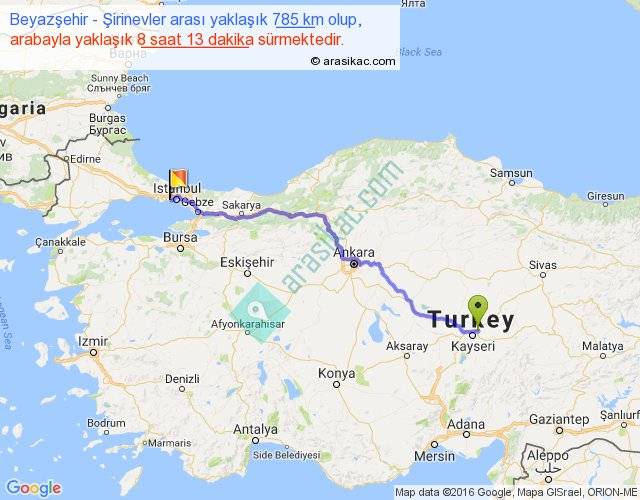 Beyazşehir - Şirinevler arası yaklaşık olarak 90 km/h ile yukarıda belirtilen sürede olup, iki yerin kuş uçuşu uzaklığı (mesafesi) 621'dir. Eğer belirtilen yerler arasında uçak seferi var ise bu süre uçakla 57 dakika'ya kadar düşebilir. Yolculuk otobüsle 10 saat 40 dakika sürmektedir.