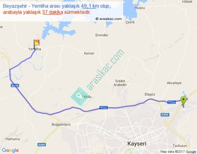 Beyazşehir - Yemliha arası yaklaşık olarak 90 km/h ile yukarıda belirtilen sürede olup, iki yerin kuş uçuşu uzaklığı (mesafesi) 31'dir. Yolculuk otobüsle 48 dakika sürmektedir.
