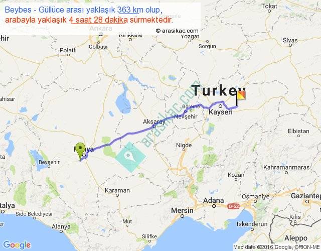 Beybes - Güllüce arası yaklaşık olarak 90 km/h ile yukarıda belirtilen sürede olup, iki yerin kuş uçuşu uzaklığı (mesafesi) 316'dir. Eğer belirtilen yerler arasında uçak seferi var ise bu süre uçakla 29 dakika'ya kadar düşebilir. Yolculuk otobüsle 5 saat 48 dakika sürmektedir.