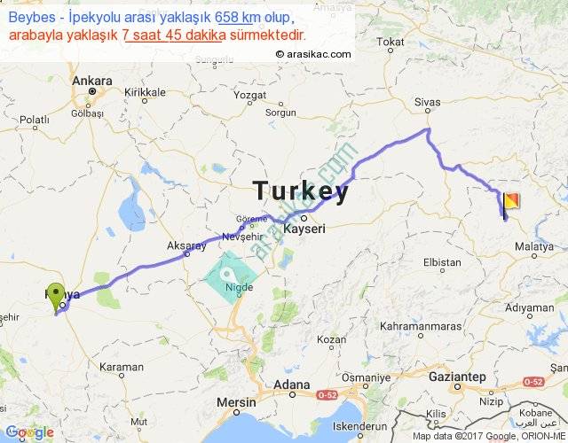 Beybes - İpekyolu arası yaklaşık olarak 90 km/h ile yukarıda belirtilen sürede olup, iki yerin kuş uçuşu uzaklığı (mesafesi) 493'dir. Eğer belirtilen yerler arasında uçak seferi var ise bu süre uçakla 45 dakika'ya kadar düşebilir. Yolculuk otobüsle 10 saat 4 dakika sürmektedir.
