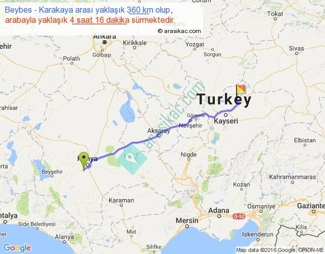 Beybes - Karakaya arası yaklaşık olarak 90 km/h ile yukarıda belirtilen sürede olup, iki yerin kuş uçuşu uzaklığı (mesafesi) 316'dir. Eğer belirtilen yerler arasında uçak seferi var ise bu süre uçakla 29 dakika'ya kadar düşebilir. Yolculuk otobüsle 5 saat 32 dakika sürmektedir.